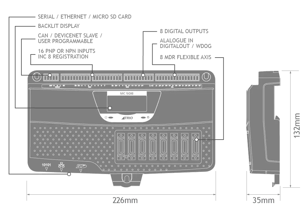Trio Motion MC508, endüstriyel otomasyonda yüksek eksen yoğunluğu ve maksimum hassasiyet arayanlar için geliştirilmiş, üst segment bir Motion Coordinator çözümüdür. Gelişmiş ARM11 işlemci mimarisi ve çoklu arayüz desteği ile en zorlu robotik ve makine kontrol uygulamalarında kesintisiz performans sunar.